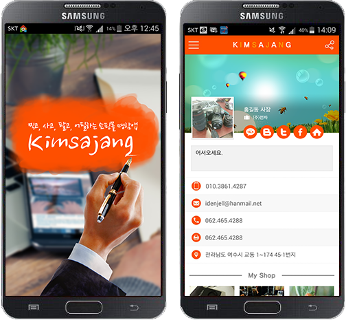 김사장앱은 모바일명함+쇼핑몰이 결합된 스토리텔링이 있는 모바일 PR 앱으로써,